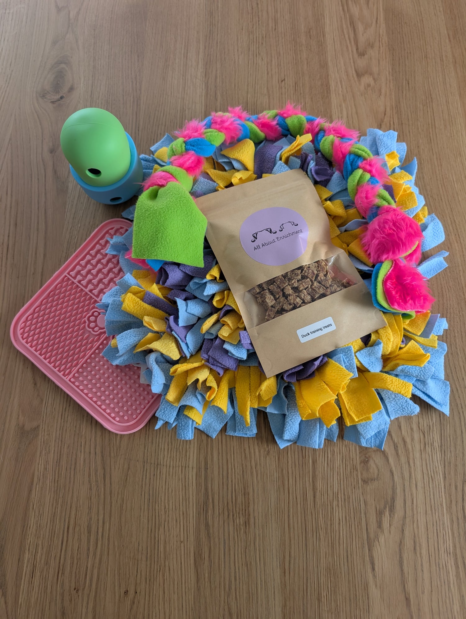 A selection of handcrafted enrichment toys including snuffle mats, snuffle balls, shredding...