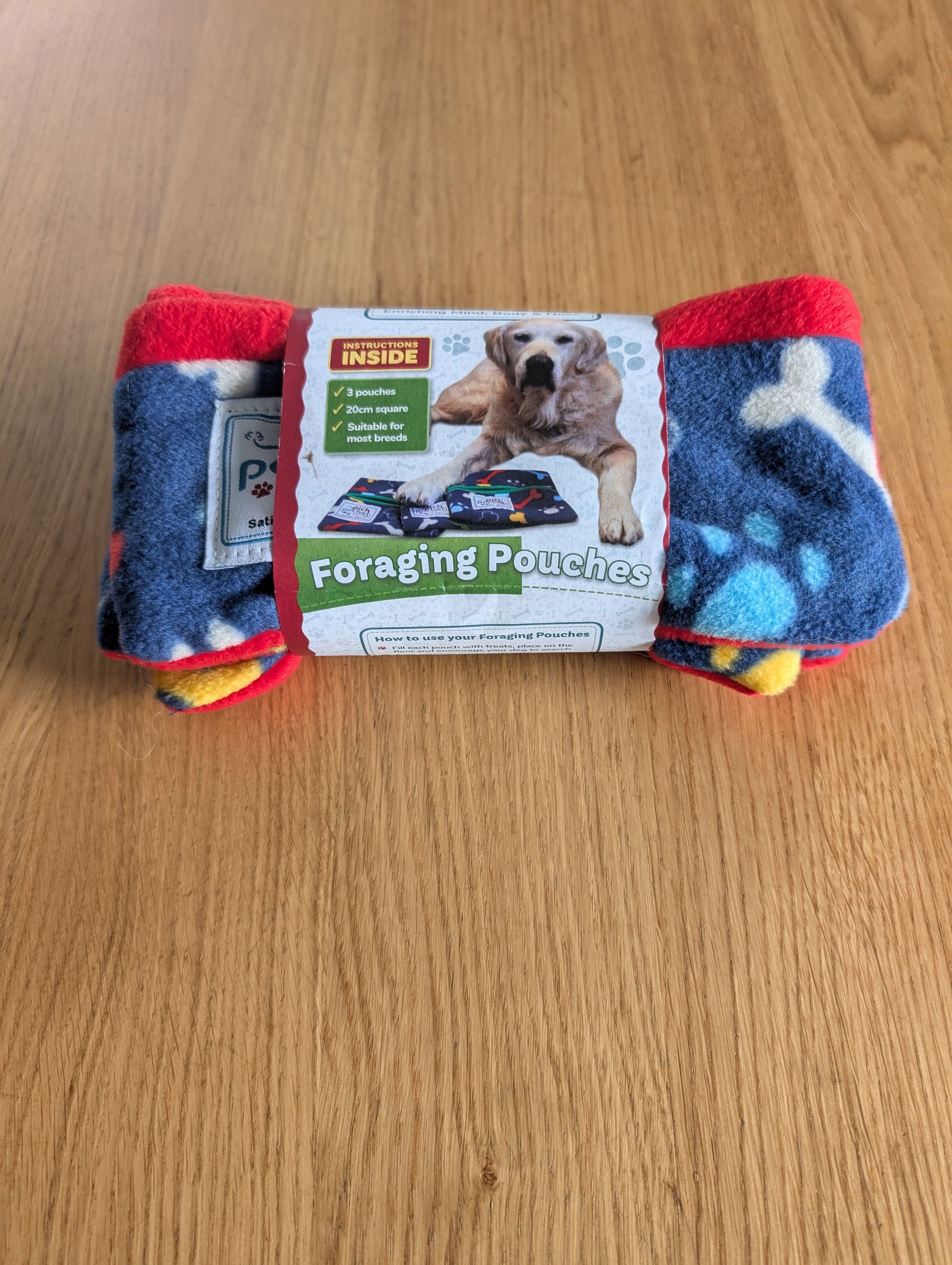 PickPocket Pouch sets are suitable for dogs of all ages and most breeds including those with flat faces. They are ideal mental stimulation for dogs on post-operative care, those on restricted exercise or for dogs with reduced mobility due to arthritic conditions. Playing with the Mini Foraging set can provide these dogs with a few minutes gentle weight-bearing exercise. Foraging games are especially beneficial to senior dogs with cognitive dysfunction and ‘golden oldies’ whose other senses may be in decline and who come to rely more on olfaction. The Mini Foraging set is especially suited to visually impaired dogs who are able to use their natural foraging skills in a game that is highly rewarding, satisfying and safe. Puppies can also hugely benefit mentally and physically from nose work activities, and PickPocket Foragers can be successfully used to distract from unwanted behaviour.